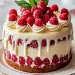A luscious White Chocolate Raspberry Dream Cake featuring moist white chocolate-infused layers, tart raspberry filling, and a smooth white chocolate buttercream frosting, perfect for special occasions or dessert indulgence.